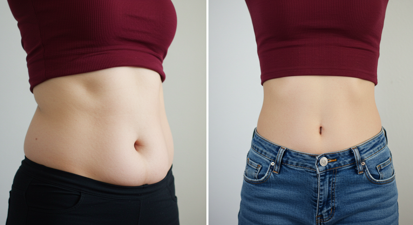 Comprehensive before and after comparison of abdominal liposuction from multiple angles including front and side views. The results demonstrate significant fat reduction around the entire midsection, creating a slimmer waistline and more defined contours. Same maroon crop top worn in all photos for consistent comparison.
